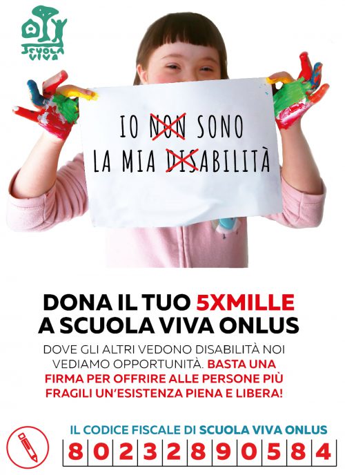L’Associazione Scuola Viva Onlus, è attiva a Roma dal 1975 e con il suo impegno contribuisce al reinserimento nella vita sociale delle persone con disabilità ed al massimo sviluppo delle autonomie. Scegliere di destinare gratuitamente la quota del 5 x 1000 a favore di Scuola Viva vuol dire sostenere progetti d’inclusione sociale e laboratori con attività educative che valorizzano le capacità e le attitudini di tutti i nostri utenti.